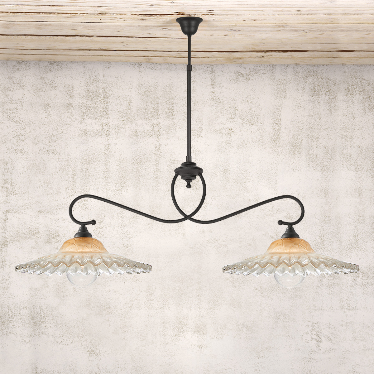 The large vintage SYROS 5046S/40/2 pendant lamp with Murano glass is a refined lighting piece that blends classic elegance with timeless design. Its curved lines and tasteful details highlight its sophisticated character, while the handcrafted metal structure — available in various finishes — adds depth and style to any interior.
