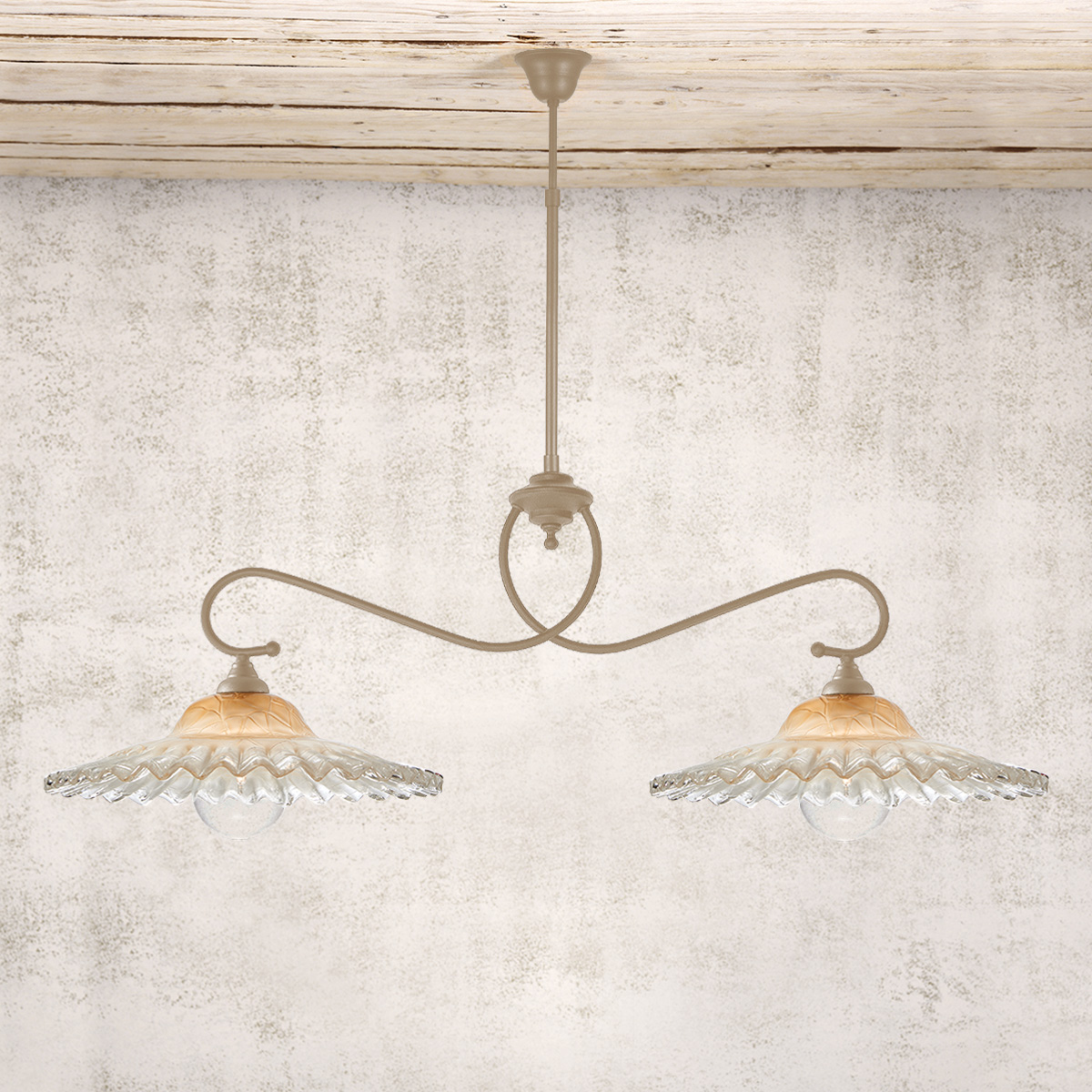 The handcrafted Murano glass, offered in amber or white tones, creates a distinctive visual effect. Its textured surface diffuses light evenly, producing warm illumination and impressive light patterns that enhance the atmosphere of the room.