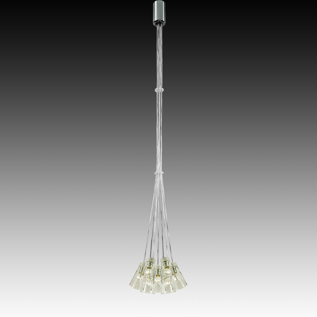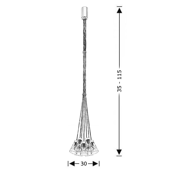 Μοντέρνο 7φωτο φωτιστικό με μακρύ ποτήρι με καλώδια διάφανα της συλλογής ΟΥΙΣΚΙ 59527L/7. Σχεδιάζεται και κατασκευάζεται στην Ελλάδα από την εταιρεία ΜΑΥΡΟΣ.