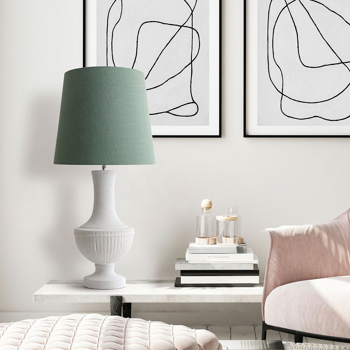 Νεοκλασική επιτραπέζια κεραμική λάμπα της συλλογής BONNET σε παλαιωμένο λευκό χρώμα και λινό καπέλο στο χρώμα της μέντας.
