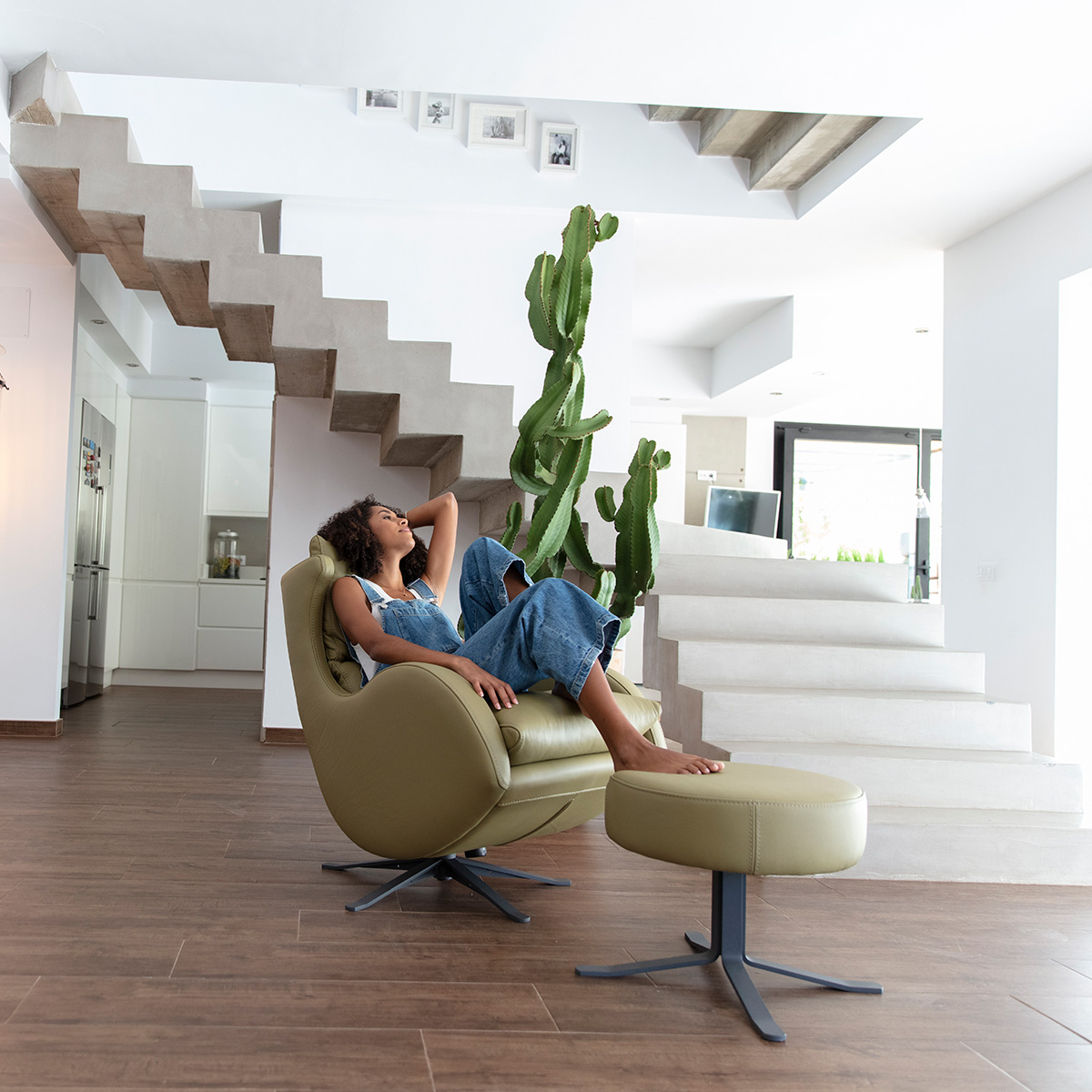 Τα μαξιλάρια του καθίσματος και της πλάτης αγκαλιάζουν το σώμα, προσφέροντας ασυναγώνιστη εργονομία και στήριξη. Το στρογγυλό υποπόδιο συμπληρώνει την εμπειρία άνεσης, επιτρέποντας πλήρη ξεκούραση των ποδιών.
